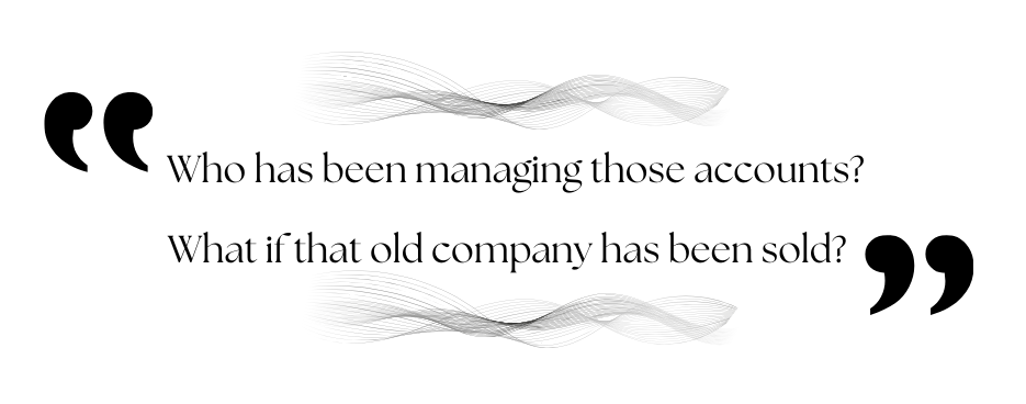 Suppose you have three accounts dating back several decades from three different jobs. Who has been managing those accounts? You don’t work there anymore, but your money was put aside through that company, which had a matching program. Does that mean they are still managing it for you, or is that being handled by the firm with whom your company was associated at the time? What if that old company has been sold?